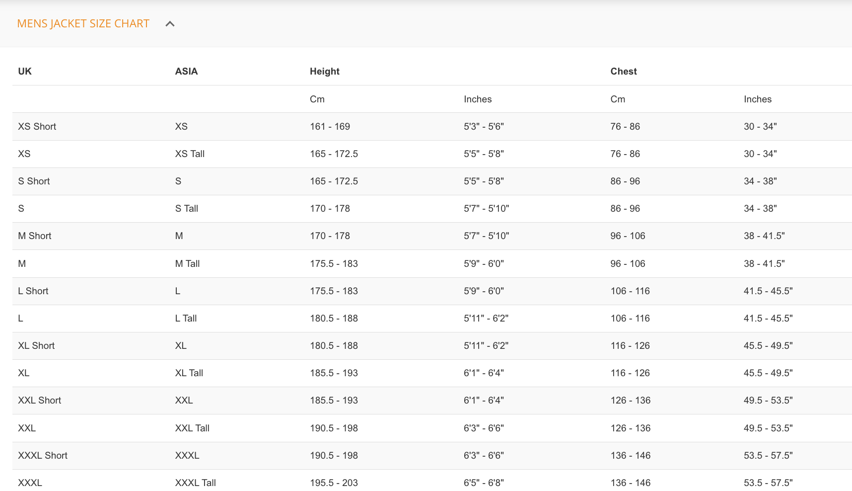 男裝尺碼 Asia S、M、L、XL、XXL