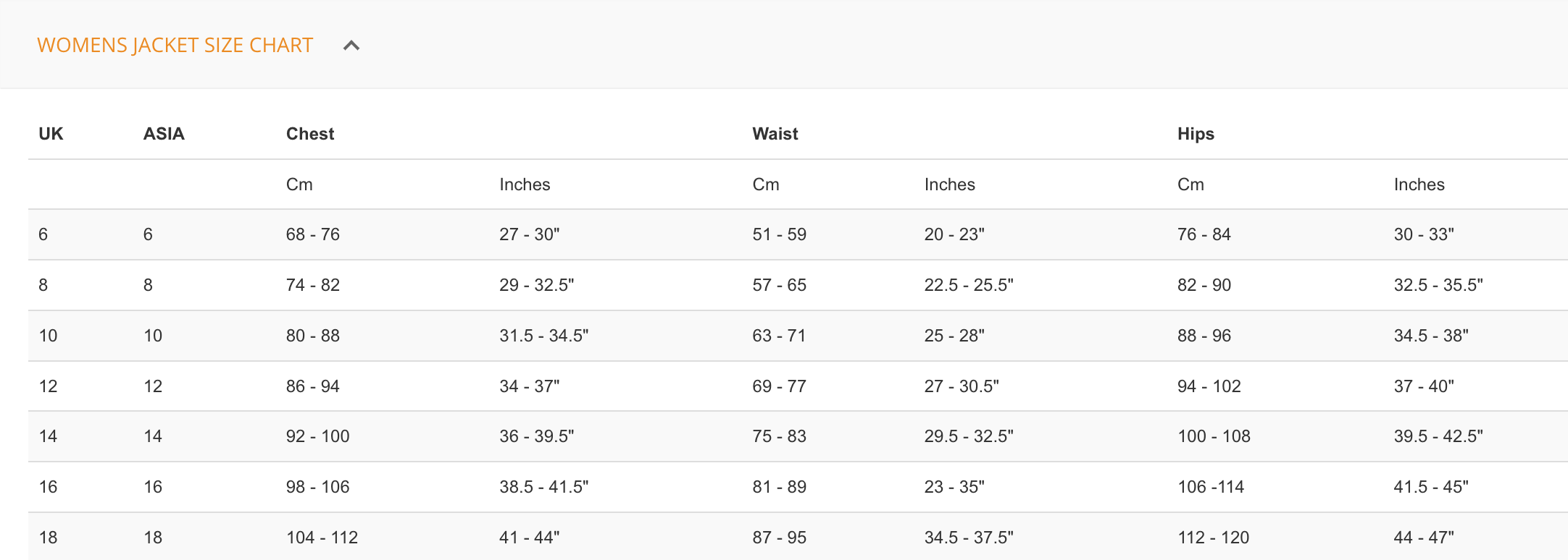 女裝尺碼 Asia 6、8、10、12、14
