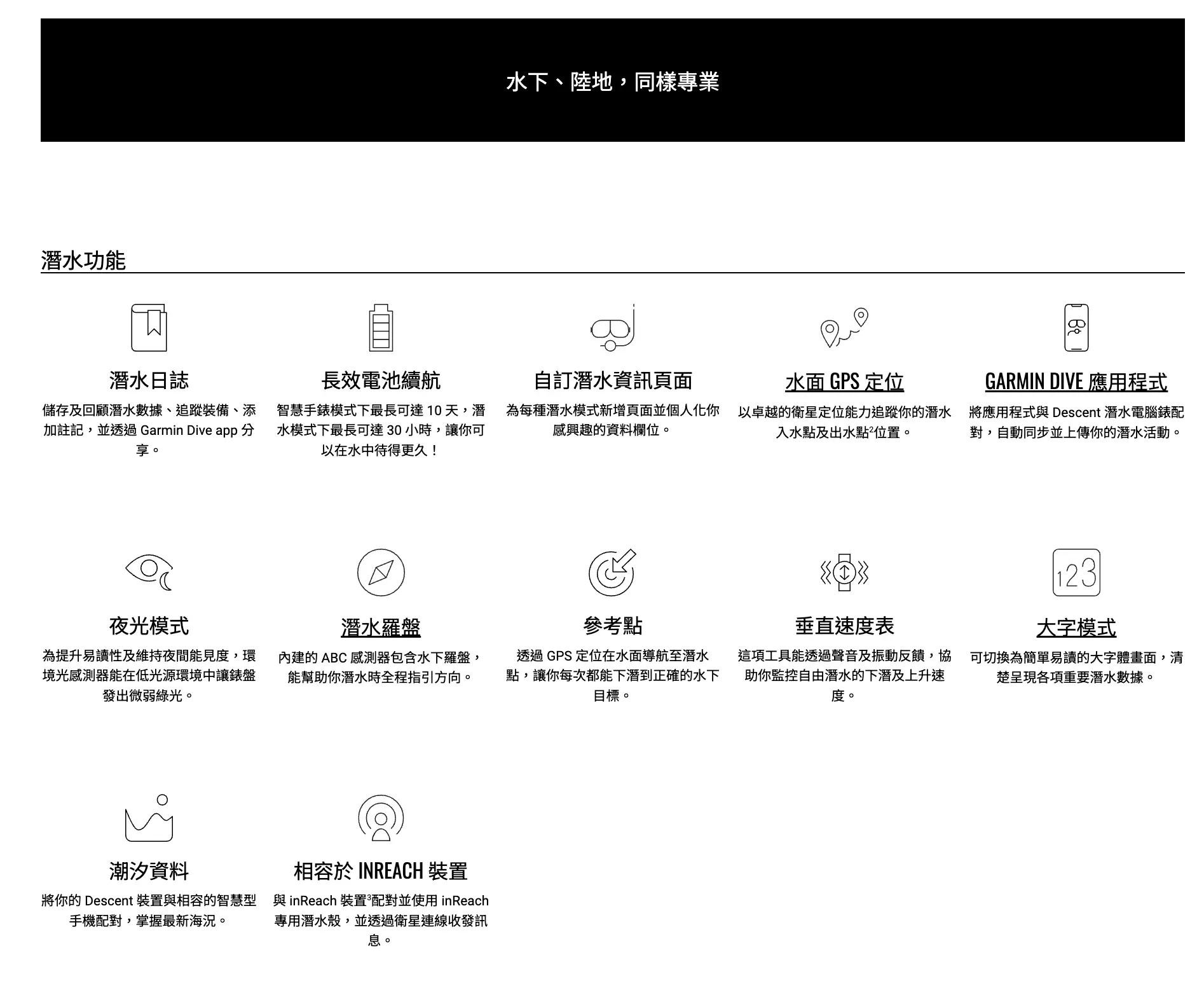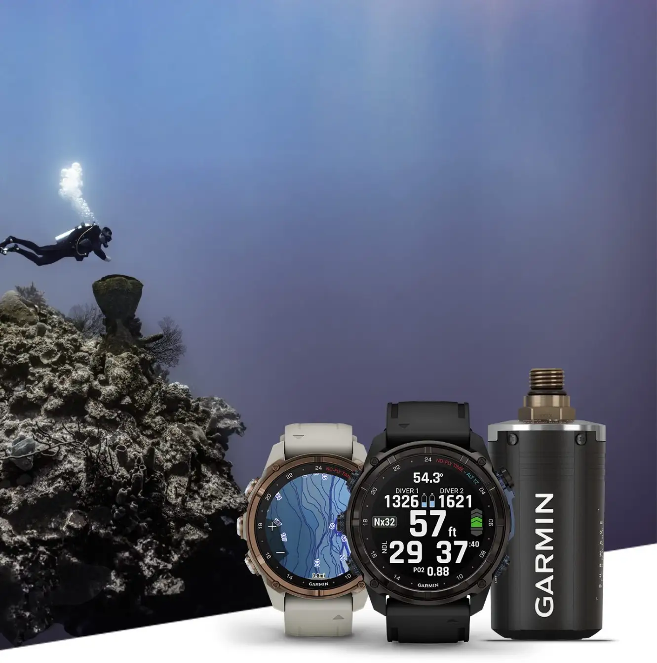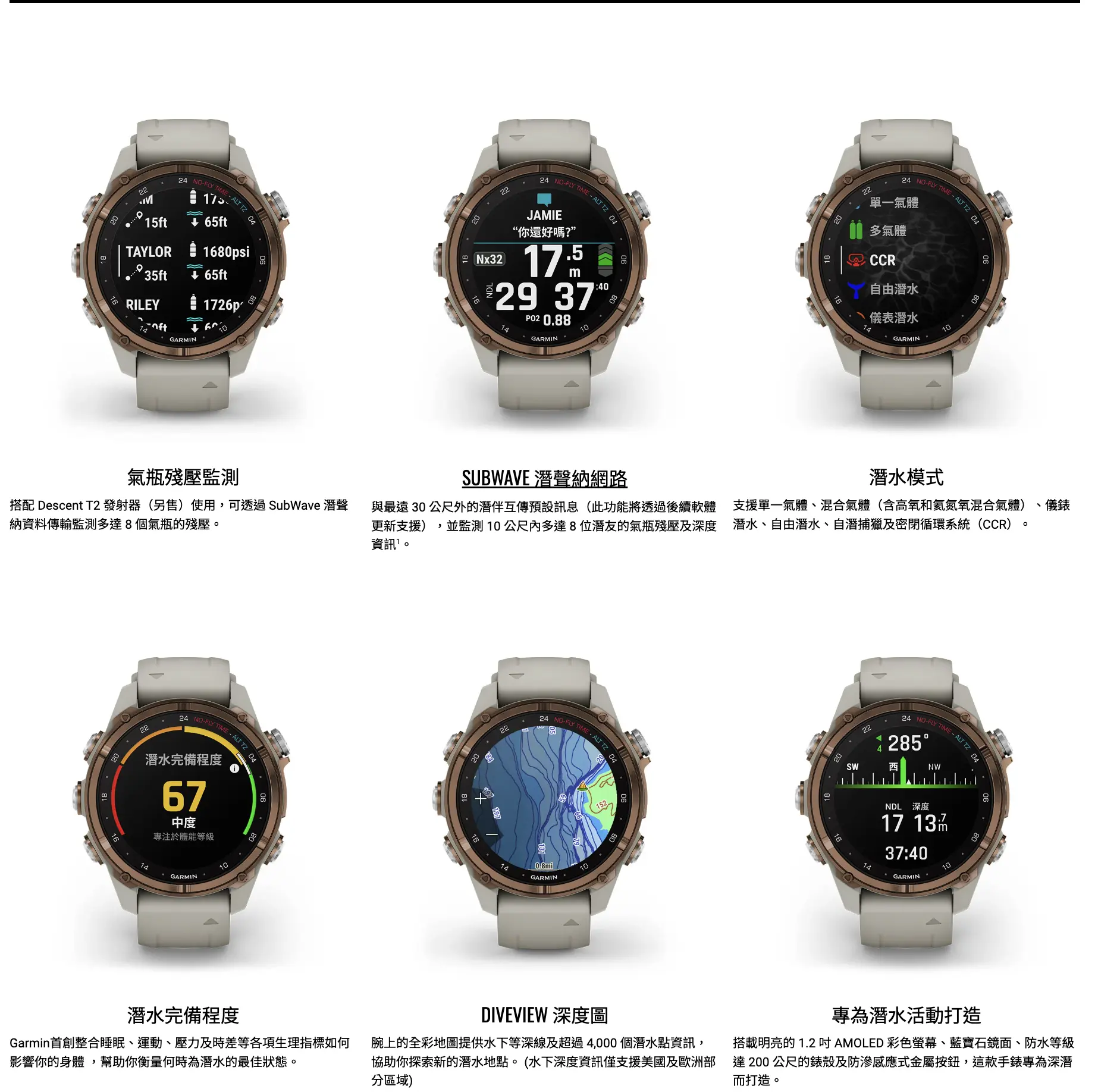 Garmin Descent Mk3i / Mk3 潛水電腦錶,是結合專業潛水功能與日常智能手錶科技的完美結晶。新一代 Mk3 系列搭載 AMOLED 螢幕、支援多達六種潛水模式,並具備創新 SubWave™ 無線氣瓶監測系統(限 Mk3i 版本),為專業與進階潛水員提供更高階的裝備選擇。