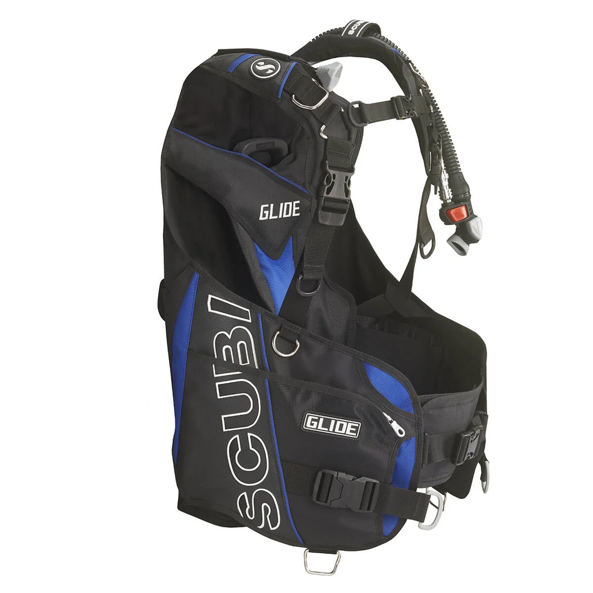 Scubapro Glide Blue BCD 非常適合重視穿著舒適度的休閒潛水員,背心式人體工學剪裁配合可調式背帶,令裝備緊貼身形,減少水中不必要的移位,讓每次潛水體驗更為愉快。