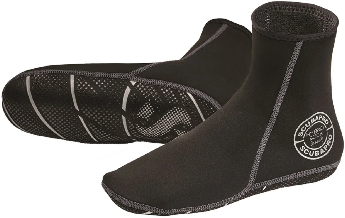 潛水襪(Dive Sock)與潛水靴(Dive Boot)的主要分別在於後者設有較硬的鞋底和腳踝保護,適合需要大量步行或岸潛的場合;潛水襪則更為輕薄靈活,主要提供保暖和緩衝保護,更適合船潛、熱帶旅遊潛水,以及搭配套腳式蛙鞋使用。Scubapro Hybrid Sock 2.5mm 因其輕薄及防滑底部設計,兼具一定的步行實用性,是旅行輕裝的理想選擇。