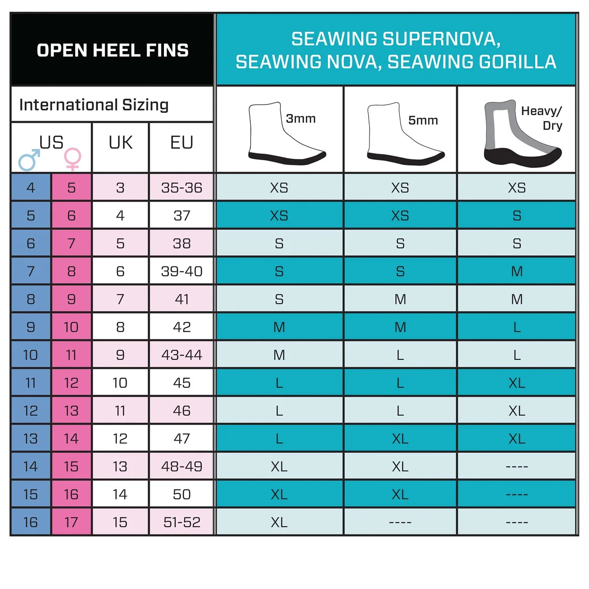 Scubapro Seawing Nova Gorilla 提供 S、M、L、XL 四個尺碼,選碼時應以穿著潛水鞋後的腳掌尺寸為準,而非赤腳尺寸。一般而言,穿薄款潛水鞋(3mm)可參考正常鞋碼選擇,穿厚款(5mm 或以上)則建議選大半至一個碼。如不確定,歡迎私訊查詢我們的裝備顧問提供尺碼建議。
